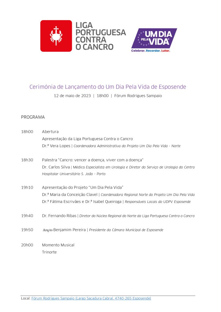 A Liga Portuguesa Contra o Cancro – Núcleo Regional do Norte e as Responsáveis Locais do projeto Um Dia Pela Vida de Esposende têm o prazer de convidar V. Exa. para estar presente na Cerimónia de Lançamento do projeto Um Dia Pela Vida de Esposende.