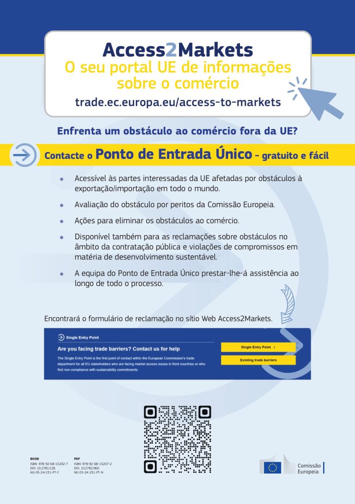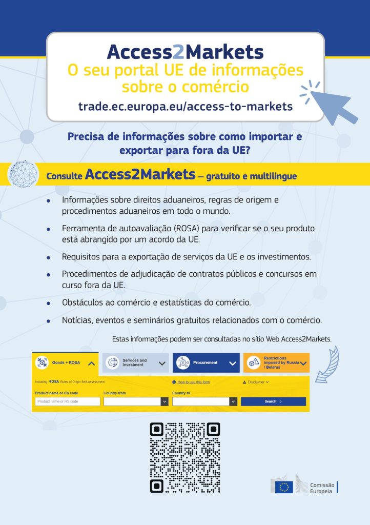 Conforme já veiculado anteriormente, o Access2Markets reúne informação sobre formalidades e procedimentos, barreiras comerciais, direitos aduaneiros aplicados ao comércio da UE, para mais de 120 mercados em todo o mundo.
